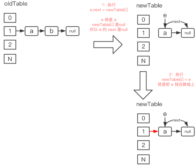 newTable 表示新的数组,newTable[i] 表示新数组下标为 i 的值,第一次循环的时候为 null,e 表示原来链表位置的头一个元素,是 a,e.next 是 b,
