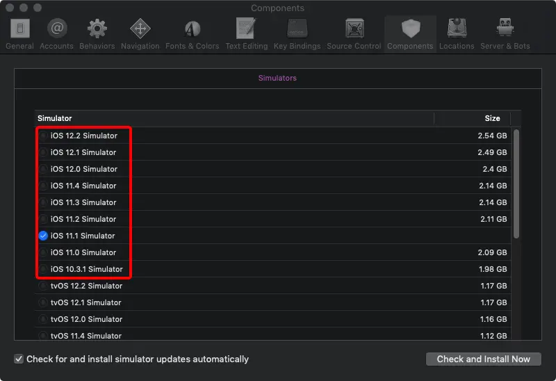升级到Xcode11以后,不能下载安装低于iOS 10.3以下的模拟器,如果有其他方法,请给我留言。Xcode10是可行的,但也有最低限制,最低的我试过iOS 9。