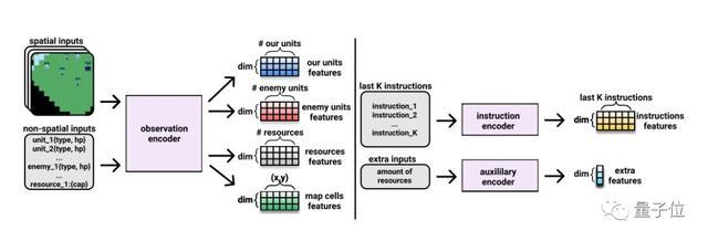 在游戏环境的每个时间步骤上,观察编码器会对每个游戏对象(游戏单位,建筑物或资源)的空间位置和非空间内部状态进行编码。
