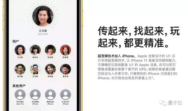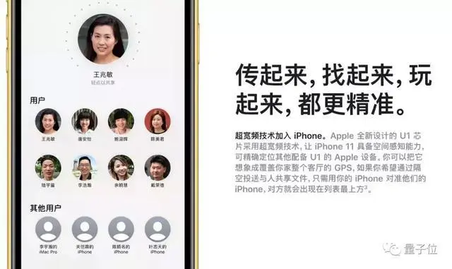 在现在的苹果官网上,只写了超宽频技术让iPhone 11具备空间感知能力,可精确定位其他配备U1的苹果设备,并且如果要使用AirDrop的话,只要双方iPhone对准就可以出现在列表最上方,让AirDrop的使用更为方便。