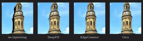 其次,根据预测的场景几何结构,要将新视图在连续的时间线上合成,这就涉及到去遮挡这样的图像修复手段。