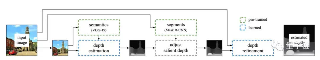 第二个网络,是Mask R-CNN。为了避免语义失真,平行于VGG-19,用Mask R-CNN对输入的高分辨率图像进行分割,而后用分割的结果来对深度图进行调整,以确保图中的每个对象都映射到一个相干平面上。
