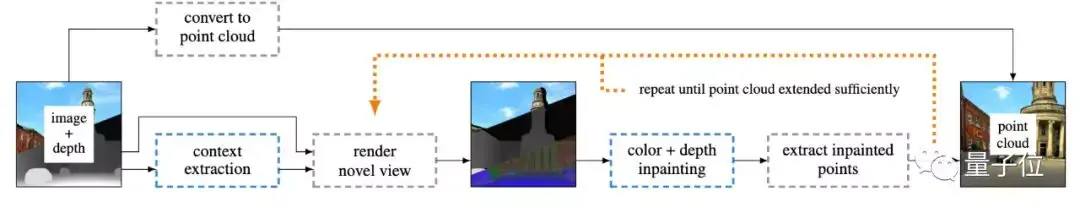 具体而言,第一步,是进行颜色和深度图像修复,以从不完整的渲染中恢复出完整的新视图,其中每个像素都包含颜色,深度和上下文信息。