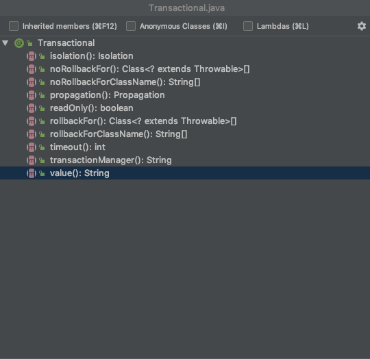 按照上篇对于几个实体类的描述,可以发现注解@Transactional的属性的字段和TransactionDefinition大致比较相似,但又不完全一致.
