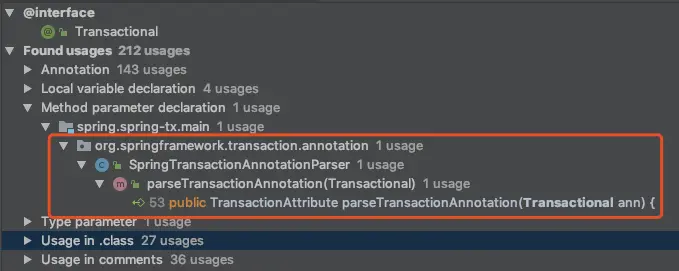 这个显然很常见,就是我们平时需要事务时用到的注解.可是spring如何去解析?我们看一下使用到这个注解的地方,排除掉在test和comment下的使用.