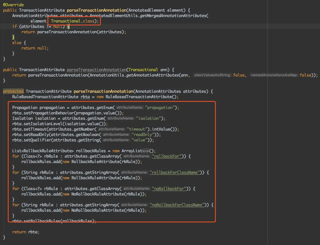 我们打开源码看一下RuleBasedTransactionAttribute和父类DefaultTransactionAttribute晚上寻找发现,事务常规的设置是继承DefaultTransactionDefinition来注入,rollback相关则实现TransactionAttribute.这就是我们上篇提到TransactionAttribute和TransactionDefinition责任的划分