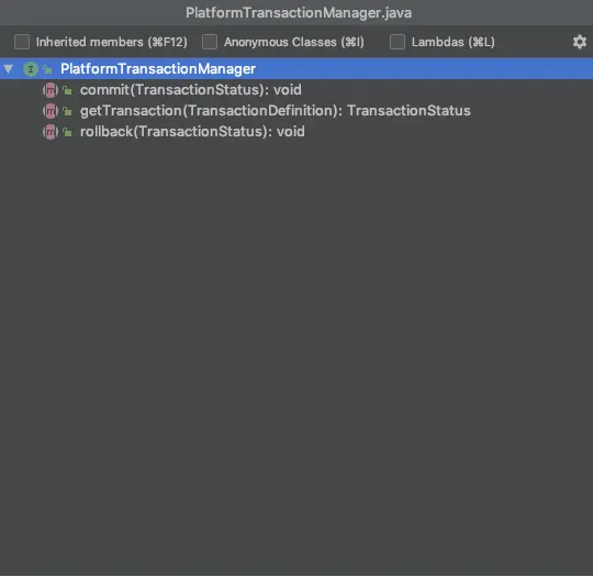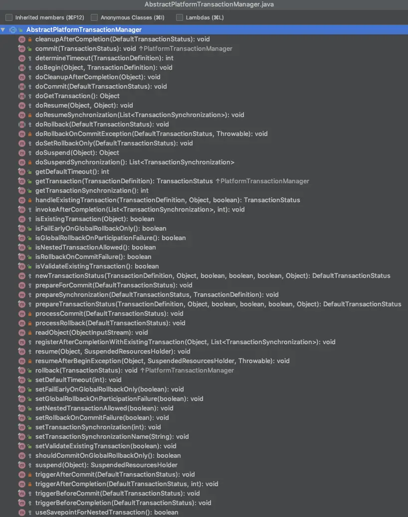 抽象子类AbstractPlatformTransactionManager, 可以发现多了很多方法.但并没有实现,用于子类继承处理