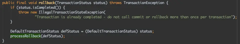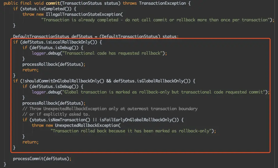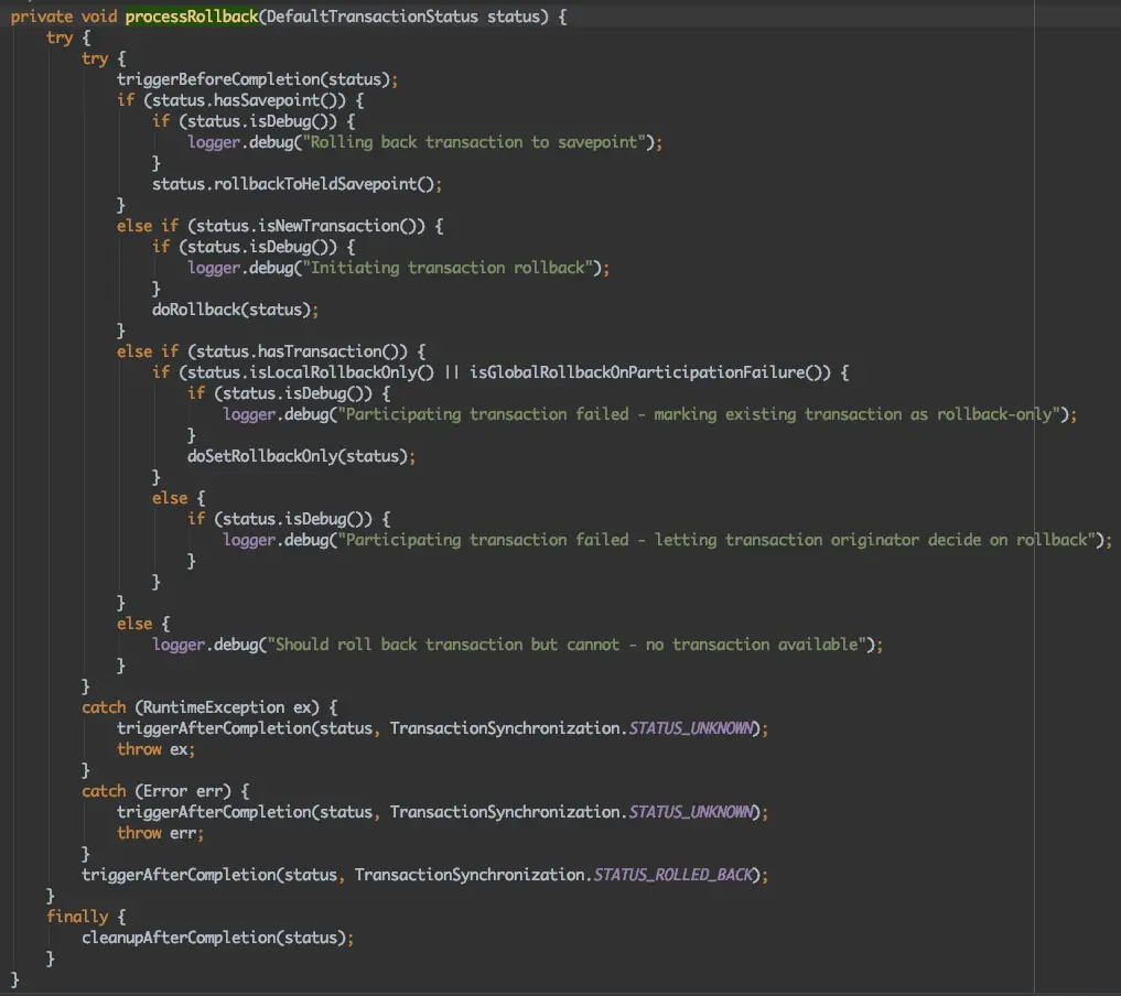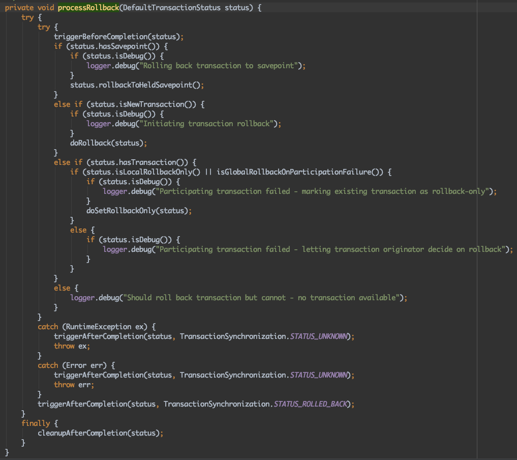 从图中看出在某种情况会执行回滚操作.最开始看到这里的时候也迷过.后来在一次事务测试时,同一个事务,方法嵌套时,内部方法抛异常,但是外部方法捕获正常处理.一部分觉得内部回滚外部不回滚.实际结果是内外都会回滚和是否捕获并没有关系. 可以回顾一下processRollback()中的status.isLocalRollbackOnly() || isGlobalRollbackOnParticipationFailure()判断