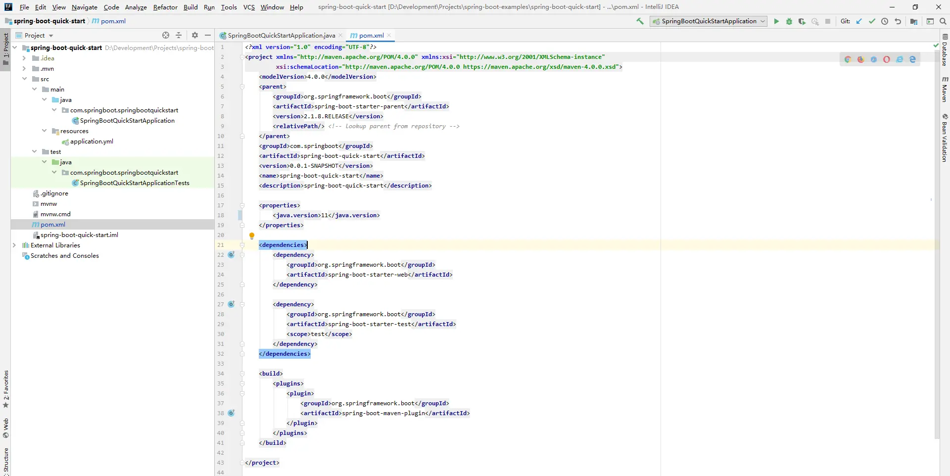 点击 next 下一步,填写和上面一样的 Group 、 Artifact 、 java 版本、 package 方式等信息,继续 next 下一步,选择依赖,和前面的方法的一样,在 Dependencies 中找到 Spring Web ,选择 Spring Web ,点击 next ,选择项目名称和存储路径,点击 finish ,静静等一会,第一个项目 spring-boot-quick-start 就新鲜出炉了~~~