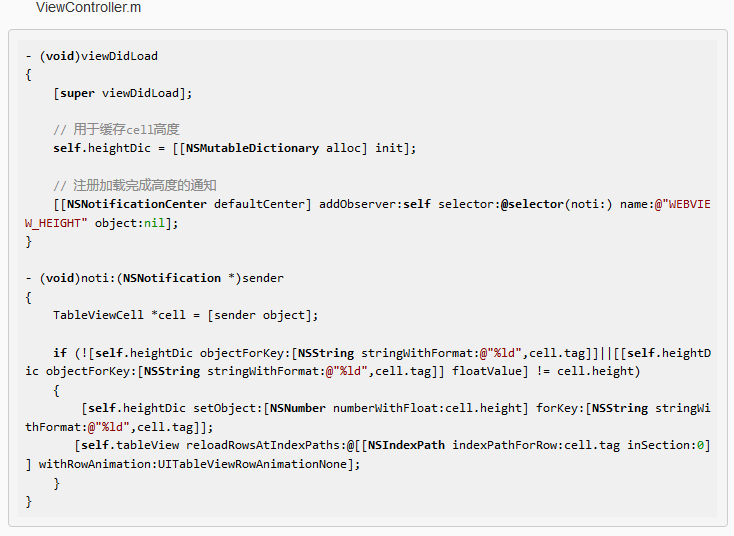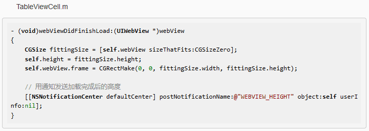 UITableViewCell 中嵌套 webview 自适应高度 卖姑娘的小火柴 2019-09-17 1,047 阅读1分钟 项目需求:UITableViewCell嵌套UIWebView,并且让UIWebView根据内容自适应高度。 1 获取UIWebView高度 2 UIWebView加载完成后cell高度的更新,使用通知来实现。