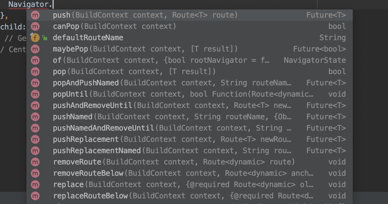 Flutter使用一个堆栈来管理路由,push为入栈,将元素添加到堆栈的顶部,相应的pop为出栈,同一堆栈中删除顶部元素。在Flutter总,push和pop,已经可以胜任我们大多数的业务场景了。push和pushNamed的基本使用我们已经在上文讲过了,Navigator的各个静态方法的使用基本和这两者类似。下面我们对其中的每个方法做一个简单的介绍: