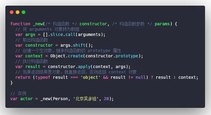 我们都知道NEW操作符可以实现构造函数的继承。 那么new操作符的原理是什么呢 我们先看一下代码部分