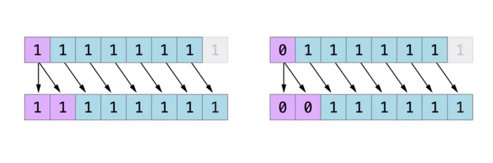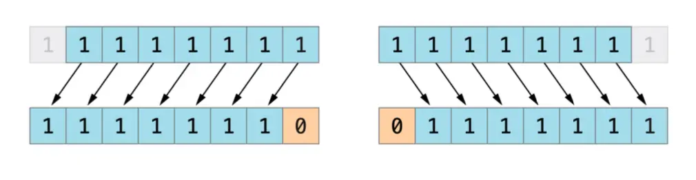 - 其次,使用二进制补码可以使负数的位左移和右移操作得到跟正数同样的效果,即每向左移一位就将自身的数值乘以2,每向右移一位就将自身的数值除以2。要达到此目的,对有符号整数的右移有一个额外的规则:当对正整数进行位右移操作时,遵循与无符号整数相同的规则,但是对于移位产生的空白位使用符号位进行填充,而不是 0 。