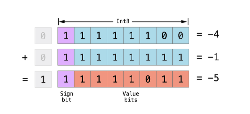 - 首先,如果想给-4加个-1,只需要将这两个数的全部八个比特位相加(包括符号 位),并且将计算结果中超出的部分丢弃。