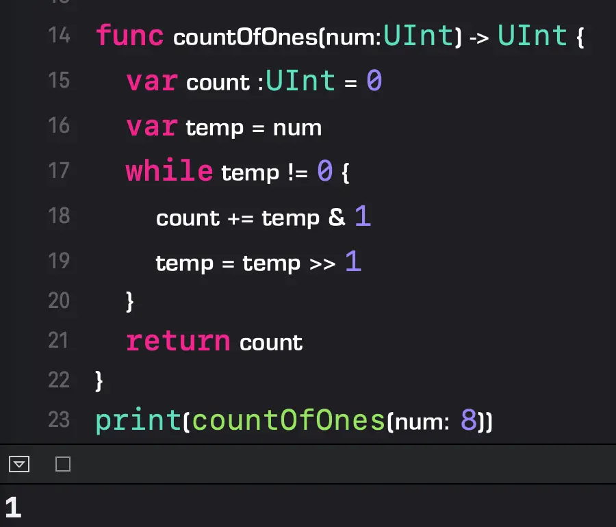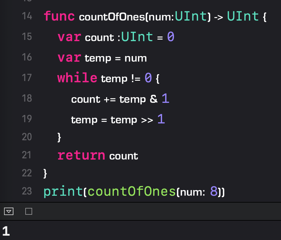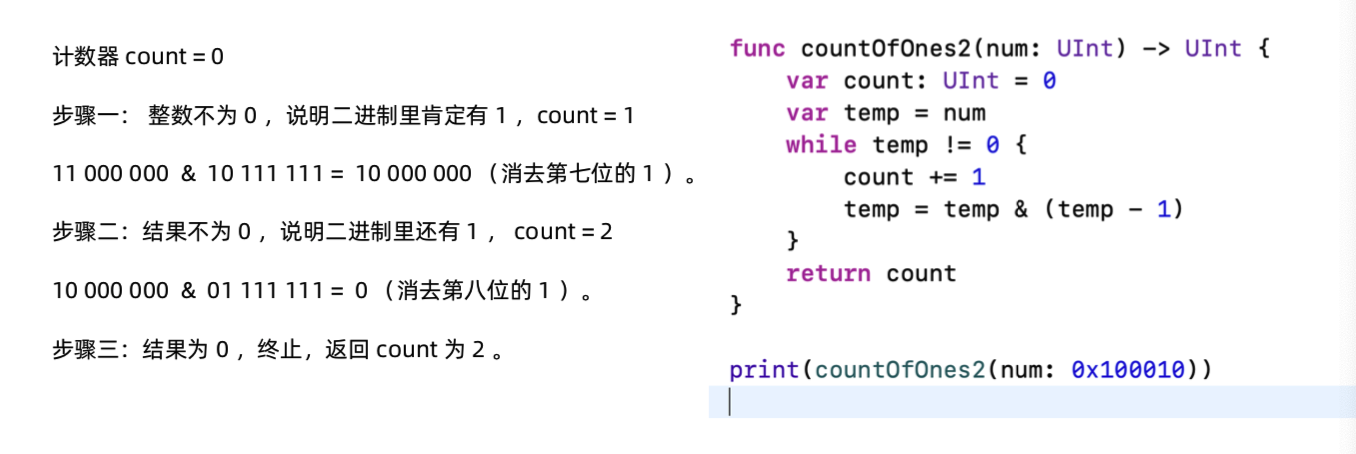 思路:为了简化这个问题,我们考虑只有高位有 1 的情况。例如:11 000 000 ,如何跳过前面低 位的 6 个 0 ,而直接判断第七位的 1 ?我们可以设计 11 000 000 和 10 111 111(也就是 11 000 000 - 1)做“与”操作,消去最低位的 1 。如果得到的结果为 0,说明我们已经找到消去里面最后一个1。如果不为0,那么说明我们消去了最低位的1,但是二进制中还有其他的1,我们的计数器需要加 1 ,然后继续上面的操作。