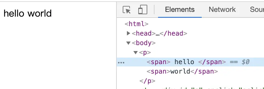 <p><!-- 这里有第一个换行符 --> <span>hello <!-- hello前后加空格也会被忽略 --></span><!-- 这里的换行符会被当成空格 --> <span><!-- world前后加空格也会被忽略 --> world</span><!-- 这里有第二个换行符 --> </p>最后的显示效果如下: