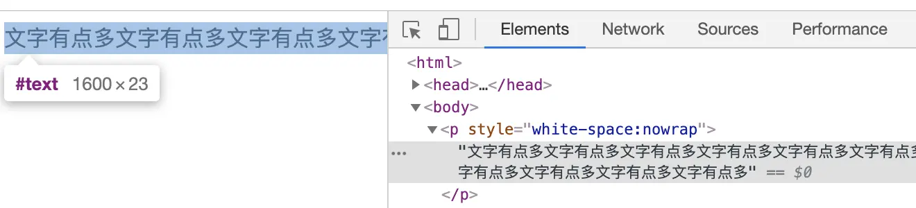 white-space:nowrap:所谓wrap,翻译成中文就是包裹,在CSS里面,我们可以理解成当一行放不下时,为了让他不超出容器,浏览器就要给文字换行,将文字包裹起来。那么nowrap就是不包裹,也就是文字超出就超出吧。<p style="white-space:nowrap">文字有点多文字有点多文字有点多文字有点多文字有点多文字有点多文字有点多文字有点多文字有点多文字有点多文字有点多文字有点多文字有点多文字有点多文字有点多文字有点多文字有点多文字有点多文字有点多文字有点多</p>最后显示的效果如下: