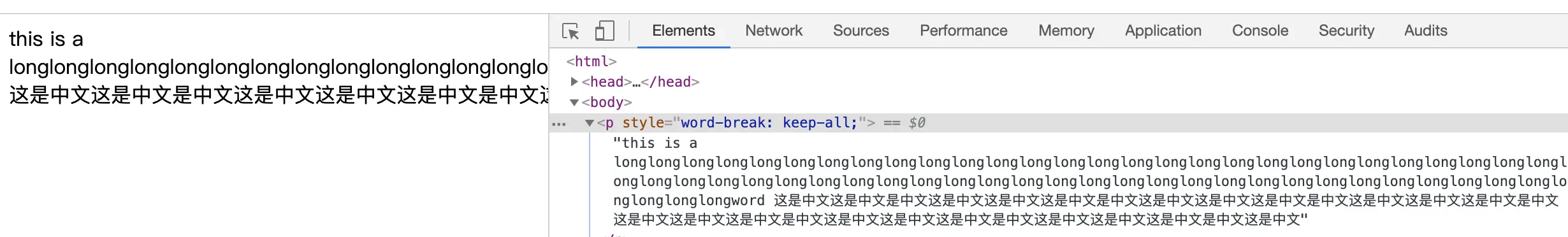 word-break:keep-all:上面在介绍浏览器的默认行为时,CJK字符和英文是分开,之所以这样,是因为word-break属性对于中英文的行为也是分开的。上面介绍的break-all值,主要也是针对英文的,汉字还是按照浏览器的默认行为,装不下就换行。对于中文来说,没有拆分不拆分,只有换行不换行。keep-all就是让中文不要换行,此时英文还是按照浏览器的默认行为来。<p style="word-break:keep-all">this is a longlonglonglonglonglonglonglonglonglonglonglonglonglonglonglonglonglonglonglonglonglonglonglonglonglonglonglonglonglonglonglonglonglonglonglonglonglonglonglonglonglonglonglonglonglonglonglonglonglonglonglonglonglonglonglonglonglonglonglongword 这是中文这是中文是中文这是中文这是中文这是中文是中文这是中文这是中文这是中文是中文这是中文这是中文这是中文是中文这是中文这是中文这是中文是中文这是中文这是中文这是中文是中文这是中文这是中文这是中文是中文这是中文</p>注意这里我在中英文之间加了个空格,否则浏览器会把后面的中文页当成是英文单词的一部分。最后显示时,英文还是按照默认行为,中文变成了不换行。