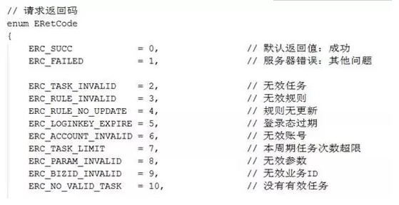 接口处理正确的结果可能只有一个,但是错误异常返回结果有很多情况很多值。如果知道返回结果有很多种,就可以针对不同结果设计用例。例如提交积分任务的时候我们通常能想到的是返回正确和错误,错误可能想到:无效任务,无效登录态,但是不一定能否完全覆盖所有错误码,而接口返回定义的返回码可以设计更多用例: