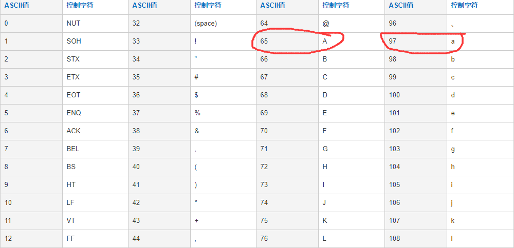 Base64的原理超级简单,相信我们都知道ASCII 编码,从A-Z、a-z、0-9和一些其他的特殊字符,这些字符都有唯一的一个数字来表示。比如说a是97,A是65。我们来截取一部分图看一下: