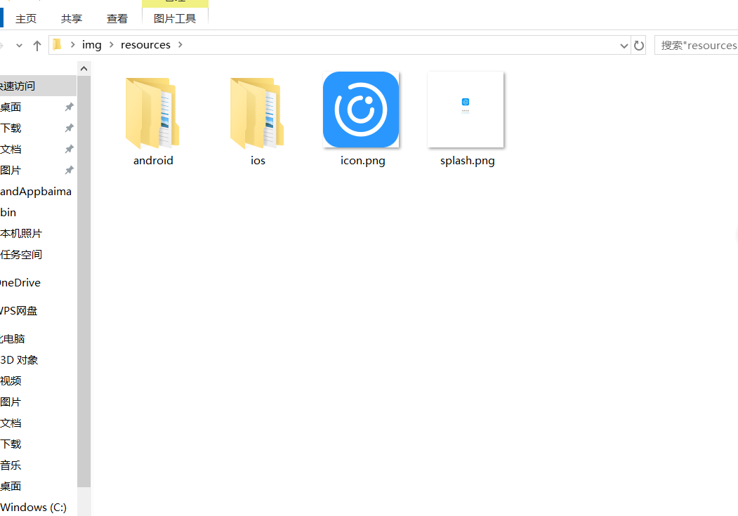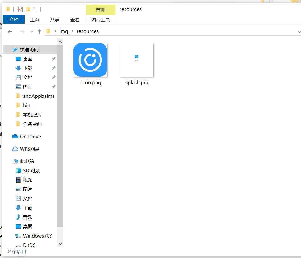把自己准备好的 icon.png(图标) 和 splash.png(启动图) 两张图放到 resources 文件夹 尽可能高清icon.png 至少 1024×1024px 像素splash.png 至少 2732×2732px 像素