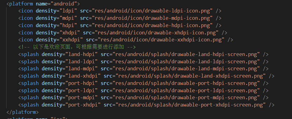 代码:<icon density="ldpi" src="res/android/icon/drawable-ldpi-icon.png" />