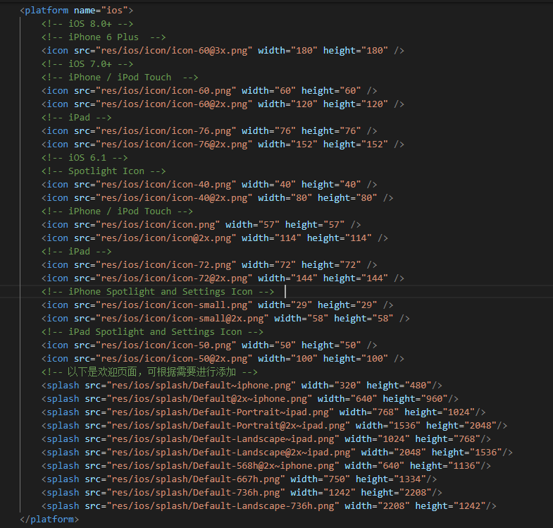 代码:<icon src="res/ios/icon/icon-60@3x.png" width="180" height="180" />