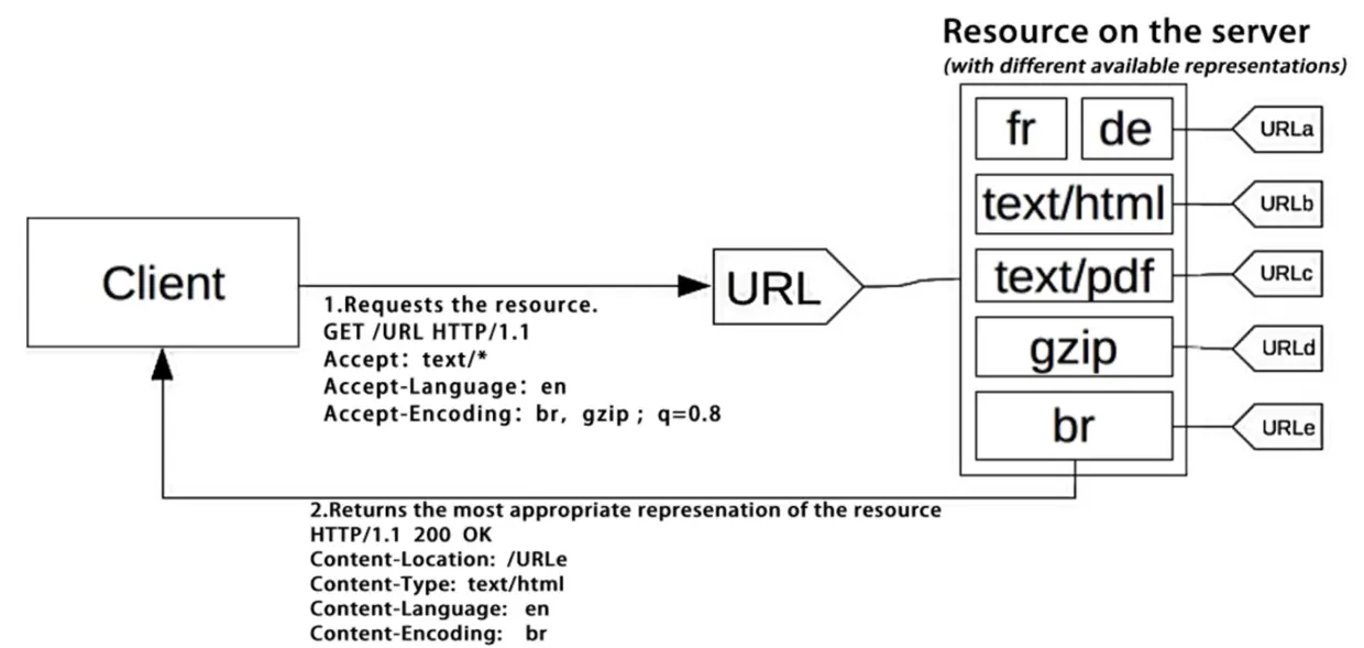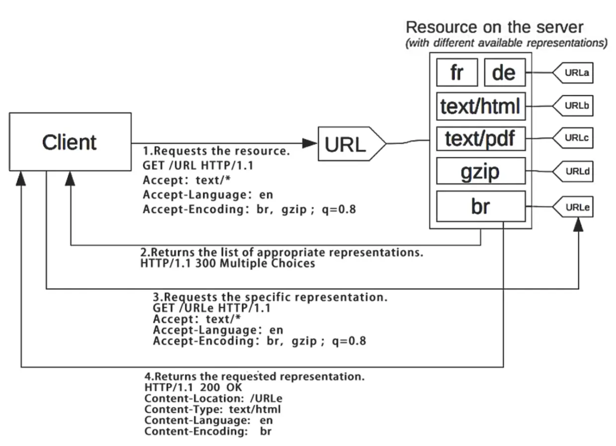 在响应式内容协商中,客户端发送请求,服务器端无法抉择要返回什么内容,所以就把客户端请求的URL对应的资源列表全部返回,然后由客户端自行抉择。客户端进行选择后再去访问指定资源