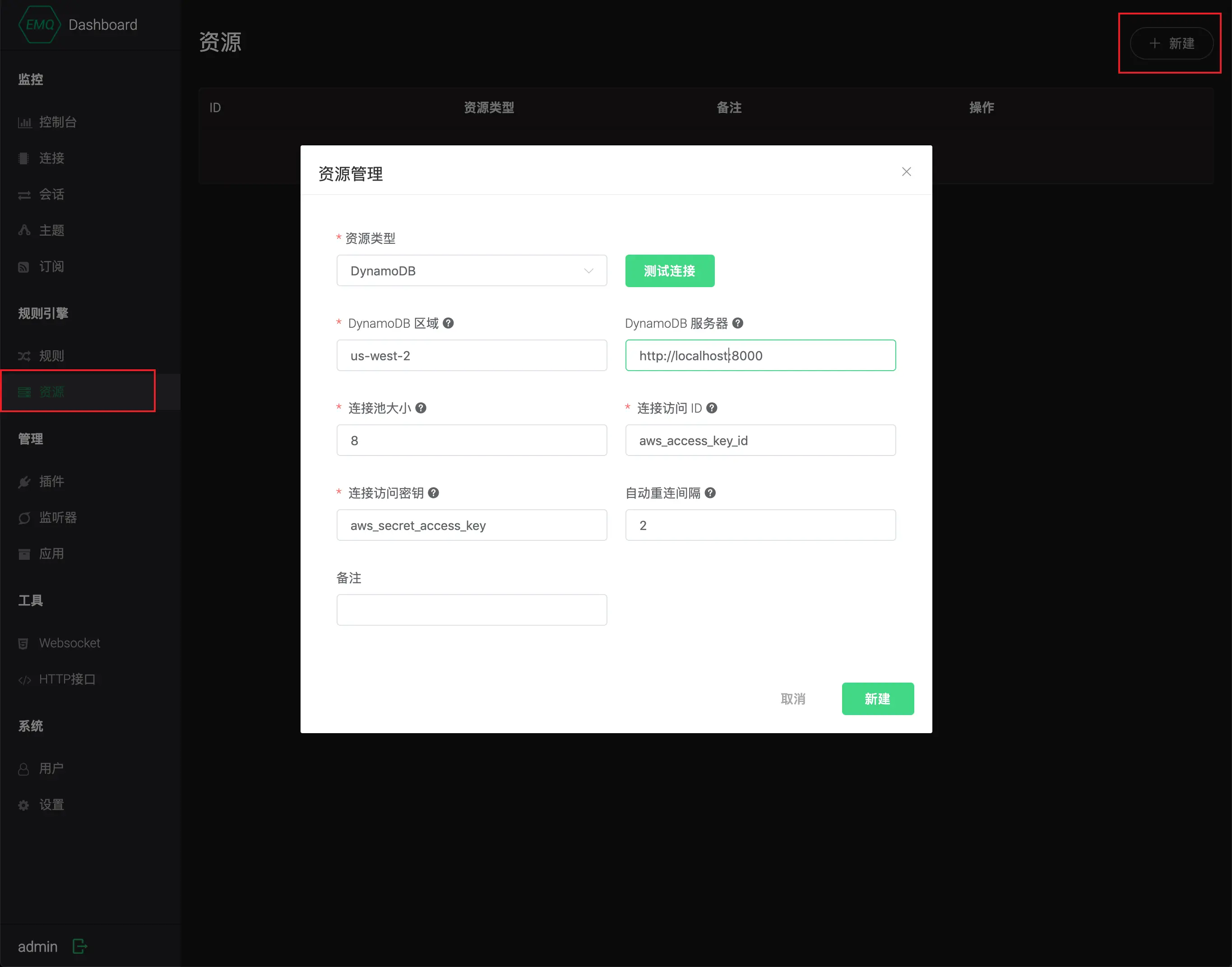 打开 EMQ X Dashboard,进入左侧菜单的 资源 页面,点击 新建 按钮,键入 DynamoDB 服务器信息进行资源创建。