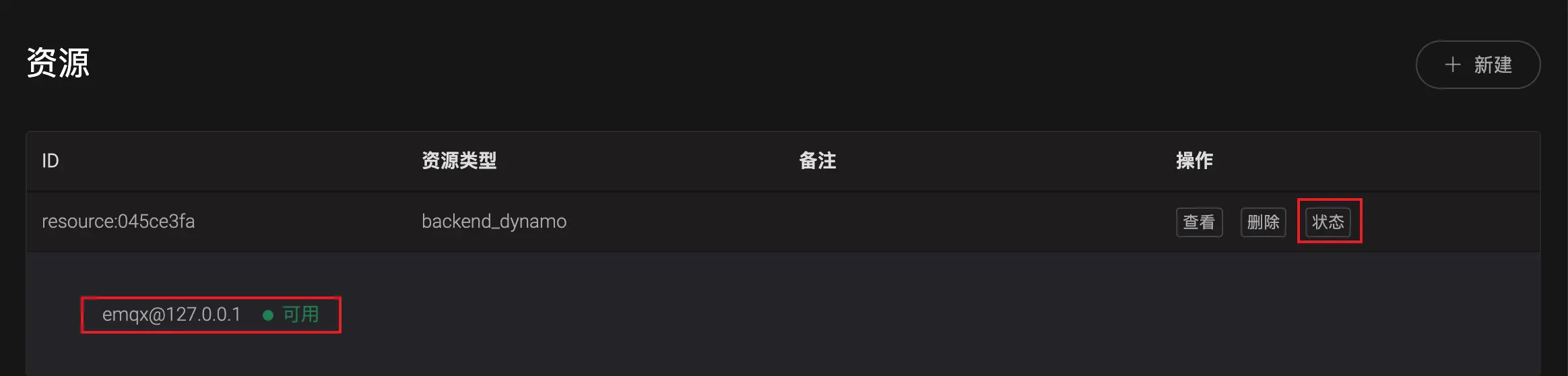 EMQ X 集群中节点所在网络环境可能互不相同,资源创建成功后点击列表中 状态按钮,查看各个节点资源连接状况,如果节点上资源不可用,请检查配置是否正确、网络连通性,并点击 重连 按钮手动重连。