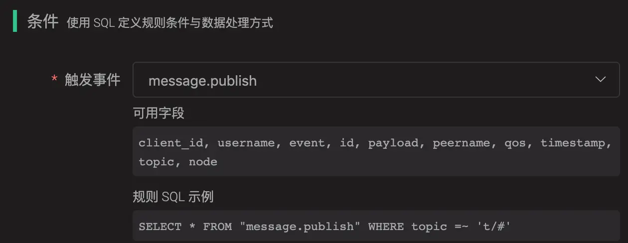 规则引擎使用 SQL 语句处理规则条件,该业务中我们需要将 payload 中所有字段单独选择出来,使用 payload.fieldName 格式进行选择,还需要消息上下文的 topic、qos、id 信息,当前 SQL 如下: