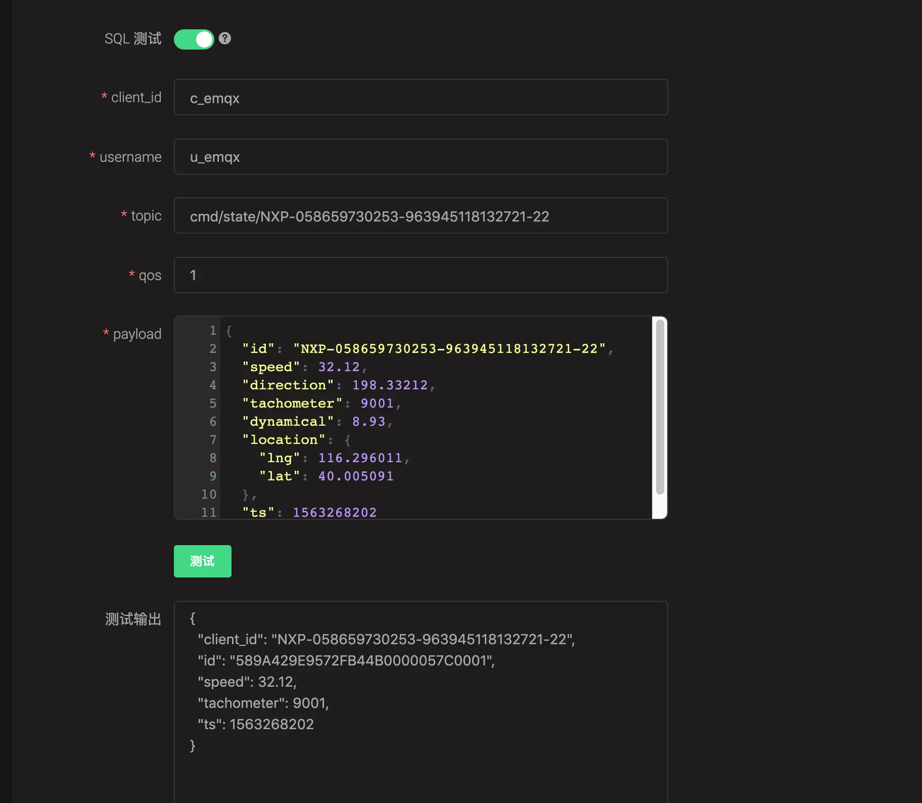 点击 SQL 测试 切换按钮,更改 topic 与 payload 为场景中的信息,点击 测试 按钮查看数据输出: