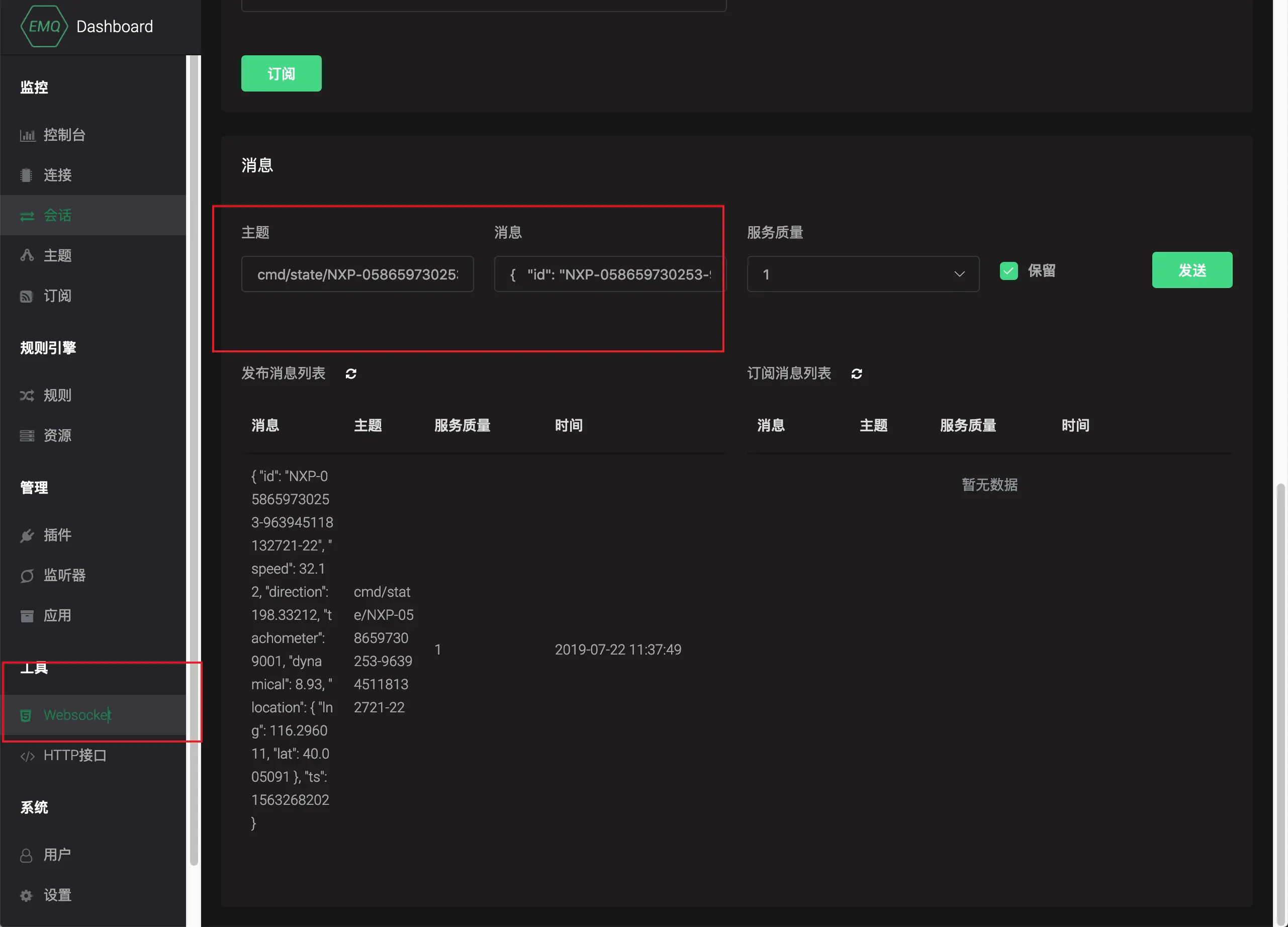 切换到 工具 --> Websocket 页面,使用任意信息客户端连接到 EMQ X,连接成功后在 消息 卡片发送如下信息: