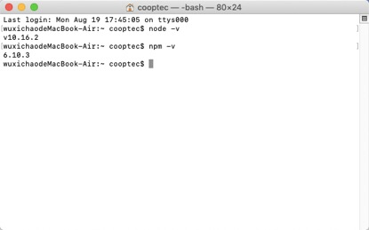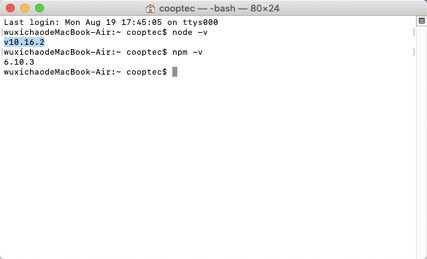 首先在终端输入以下命令查看电脑是否安装Node.js和npm