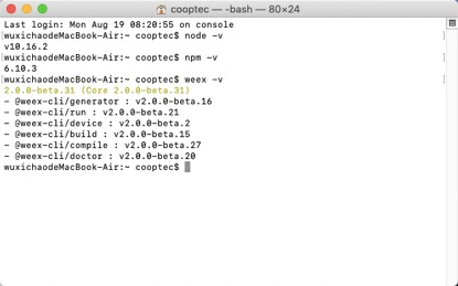 注意: 在weex-toolkit1.0.8版本后添加了npm5规范的npm-shrinkwrap.json用于锁定包依赖,故npm版本<5的用户需要更新一下npm的版本,使用前请确认版本是否正确。
