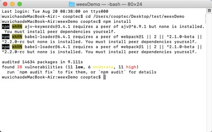 在终端cd到weexDemo目录下,执行前端依赖操作,该操作会将package.json目录下的依赖安装到weex项目中