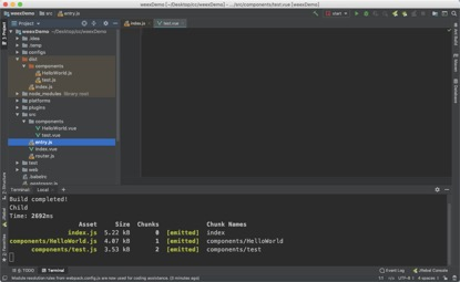 要想在app展示weex项目需要将项目文件打包成js文件,在项目终端运行下面命令,就会把src文件中的源码打包成js文件存放在文件目录中dist文件夹,默认只有一个index.js。