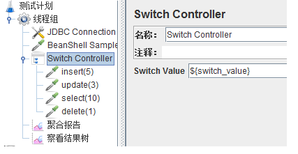然后要添加一个逻辑控制器:switch controller(该步的含义是:当switch value=0时,运行insert(5)的请求;当switch value=1时,运行update(3);以此类推......