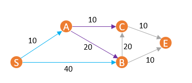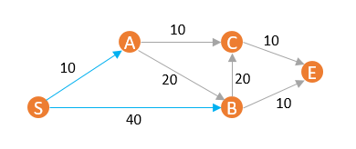 此时各节点距离分别是{ d(S) = 0,d(A) = 10,d(B) = 40,d(C) = ∞,d(E) = ∞ }。