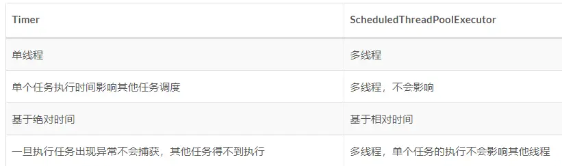 Timer不会捕获执行TimerTask时所抛出的异常,由于Timer是单线程,所以一旦出现异常,则线程就会终止,其他任务也得不到执行。