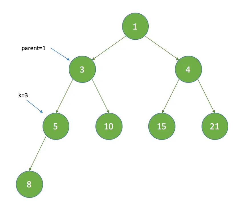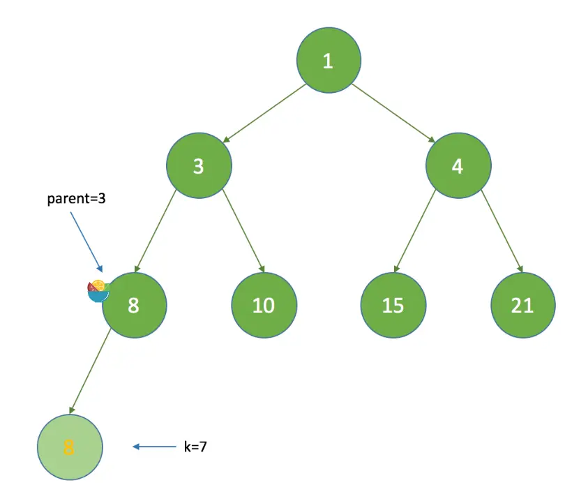 2.计算新父节点的索引:parent = (k - 1) >>> 1,parent = 3,那么queue[3]的时间间隔值为8,因为 5 < 8 ,将执行queue[7] = queue[3]: