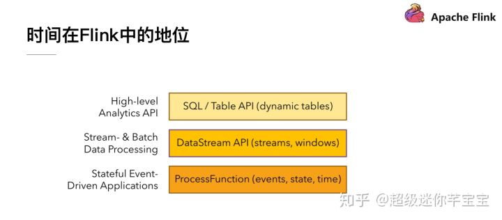 Flink 的 API 大体上可以划分为三个层次:处于最底层的 ProcessFunction、中间一层的 DataStream API 和最上层的 SQL/Table API,这三层中的每一层都非常依赖于时间属性。时间属性是流处理中最重要的一个方面,是流处理系统的基石之一,贯穿这三层 API。在 DataStream API 这一层中因为封装方面的原因,我们能够接触到时间的地方不是很多,所以我们将重点放在底层的 ProcessFunction 和最上层的 SQL/Table API。