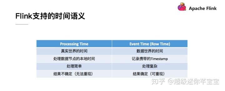 这两种时间在 Flink 内部的处理以及还是用户的实际使用方面,难易程度都是不同的。相对而言的 Processing Time 处理起来更加的简单,而 Event Time 要更麻烦一些。而在使用 Processing Time 的时候,我们得到的处理结果(或者说流处理应用的内部状态)是不确定的。而因为在 Flink 内部对 Event Time 做了各种保障,使用 Event Time 的情况下,无论重放数据多少次,都能得到一个相对确定可重现的结果。
