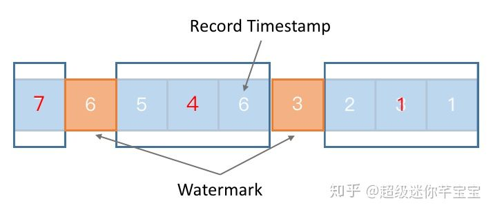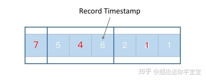 - 而在用 Event Time 的时候因为时间是绑定在每一条的记录上的,由于网络延迟、程序内部逻辑、或者其他一些分布式系统的原因,数据的时间可能会存在一定程度的乱序,比如上图的例子。在 Event Time 场景下,我们把每一个记录所包含的时间称作 Record Timestamp。如果 Record Timestamp 所得到的时间序列存在乱序,我们就需要去处理这种情况。