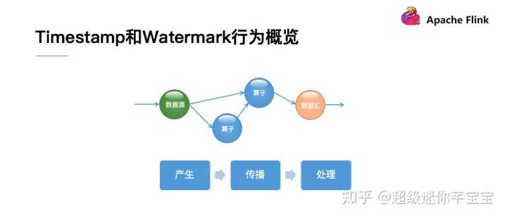 接下来我们重点看一下 Event Time 里的 Record Timestamp(简写成 timestamp)和 watermark 的一些基本信息。绝大多数的分布式流计算引擎对于数据都是进行了 DAG 图的抽象,它有自己的数据源,有处理算子,还有一些数据汇。数据在不同的逻辑算子之间进行流动。watermark 和 timestamp 有自己的生命周期,接下来我会从 watermark 和 timestamp 的产生、他们在不同的节点之间的传播、以及在每一个节点上的处理,这三个方面来展开介绍。