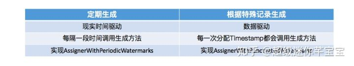 两者的区别主要有三个方面,首先定期生成是现实时间驱动的,这里的“定期生成”主要是指 watermark(因为 timestamp 是每一条数据都需要有的),即定期会调用生成逻辑去产生一个 watermark。而根据特殊记录生成是数据驱动的,即是否生成 watermark 不是由现实时间来决定,而是当看到一些特殊的记录就表示接下来可能不会有符合条件的数据再发过来了,这个时候相当于每一次分配 Timestamp 之后都会调用用户实现的 watermark 生成方法,用户需要在生成方法中去实现 watermark 的生成逻辑。