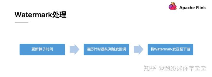 一个算子的实例在收到 watermark 的时候,首先要更新当前的算子时间,这样的话在 ProcessFunction 里方法查询这个算子时间的时候,就能获取到最新的时间。第二步它会遍历计时器队列,这个计时器队列就是我们刚刚说到的 timer,你可以同时注册很多 timer,Flink 会把这些 Timer 按照触发时间放到一个优先队列中。第三步 Flink 得到一个时间之后就会遍历计时器的队列,然后逐一触发用户的回调逻辑。 通过这种方式,Flink 的某一个任务就会将当前的 watermark 发送到下游的其他任务实例上,从而完成整个 watermark 的传播,从而形成一个闭环。