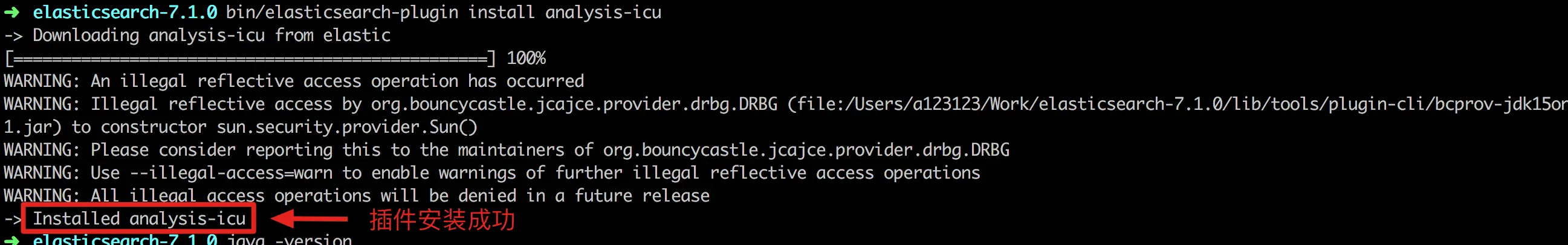 接下来,再通过 bin/elasticsearch-plugin list命令就可以看到 analysis-icu插件已经显示在列表中了: