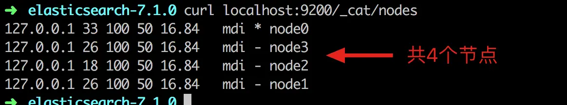 启动成功后,我们可以通过 /_cat/nodes API 来查看集群节点信息: