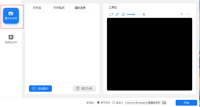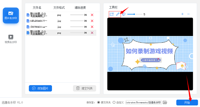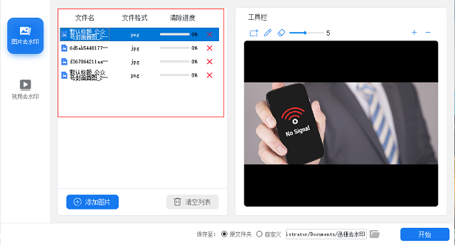 5、选择列表中的一张照片,在界面的右侧就会显示出对应的照片,在其上方有个工具栏,里面两个去水印工具、一个橡皮擦工具以及放大缩小工具。用去水印工具画出或覆盖住照片中有水印的地方,然后点击一下“开始”按钮。